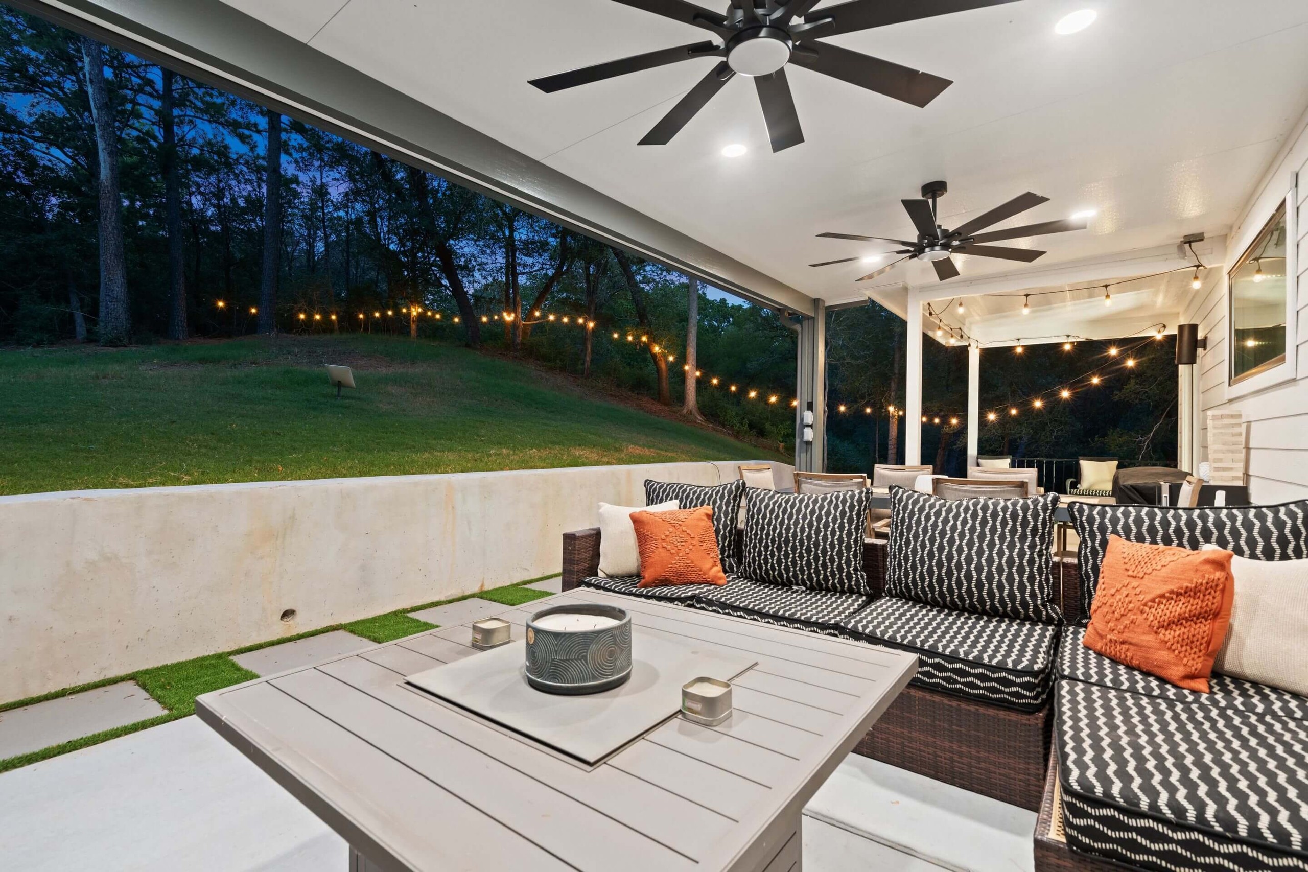 Designed for year-round use, this covered outdoor living space blends comfort, structure, and atmosphere. Clean concrete surfaces anchor the space while the overhead cover, integrated lighting, and ceiling fans create a setting that feels just as refined at night as it does during the day. The result is a seamless extension of the home built for relaxed hosting and everyday enjoyment. ⸻